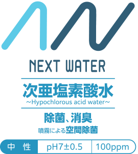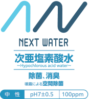 除菌・消臭・空間噴霧が主目的となりますが、強酸性・弱酸性・微酸性・中性などpHによって呼称・特徴が異なります。NEXT WATERは『中性』に属します。