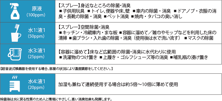 ●下記表を参考に、用途に合わせて使用方法、濃度を変えてお使いください。