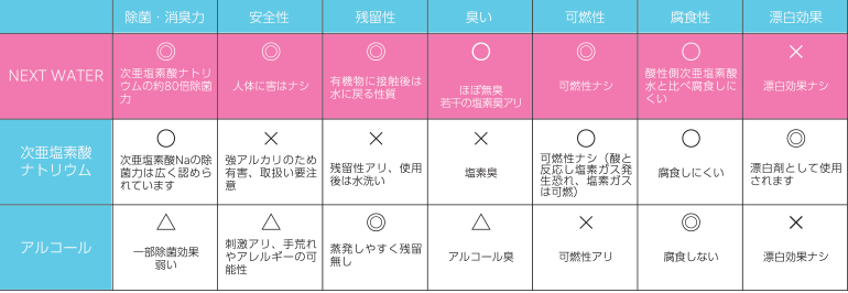 除菌・消臭の目的は同じです。ただNEXT WATERは中性域であることから以下の特徴があります。