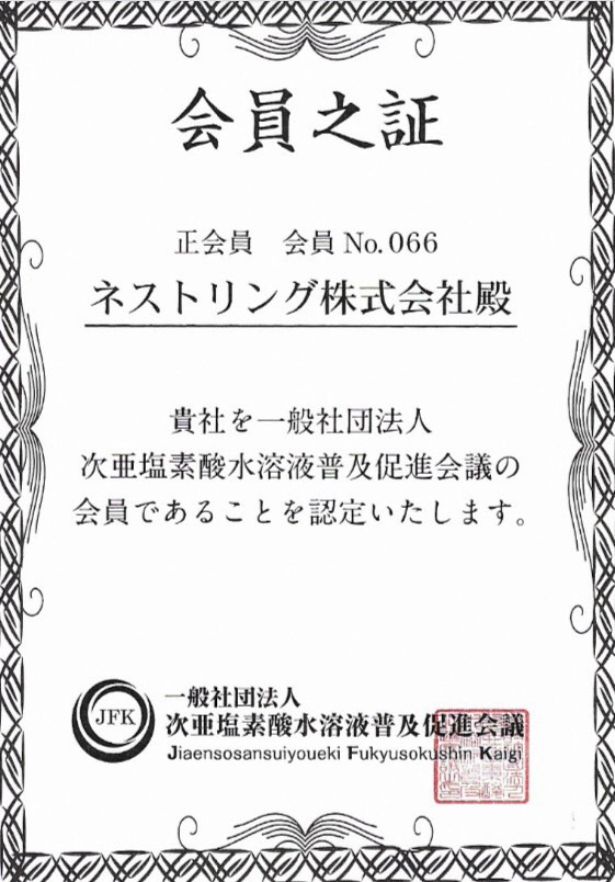 ネストリング株式会社は一般社団法人次亜塩素酸水溶液普及促進会議の正会員として認定されました。 この先も次亜塩素酸水の正しい普及促進に努めてまいります。